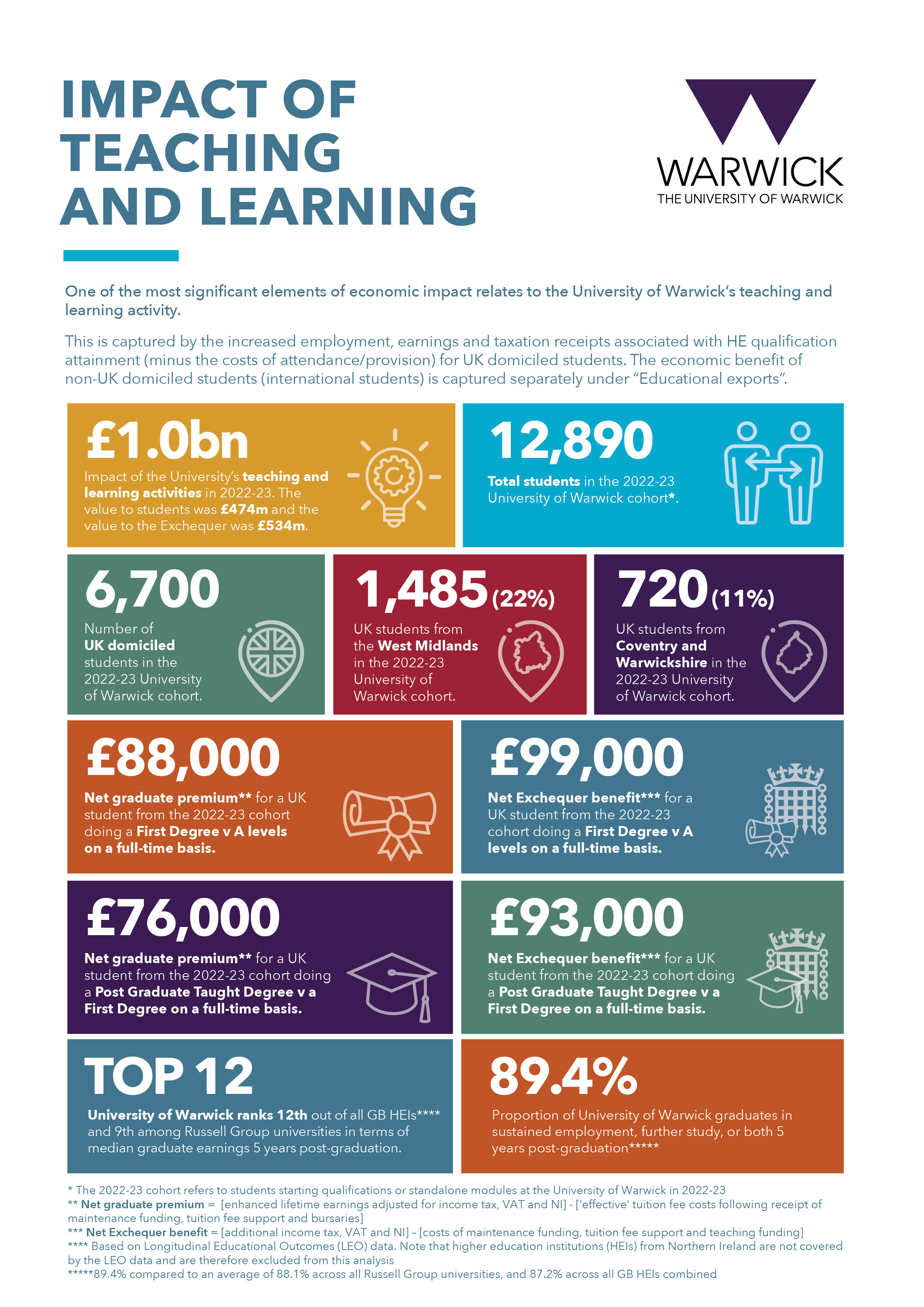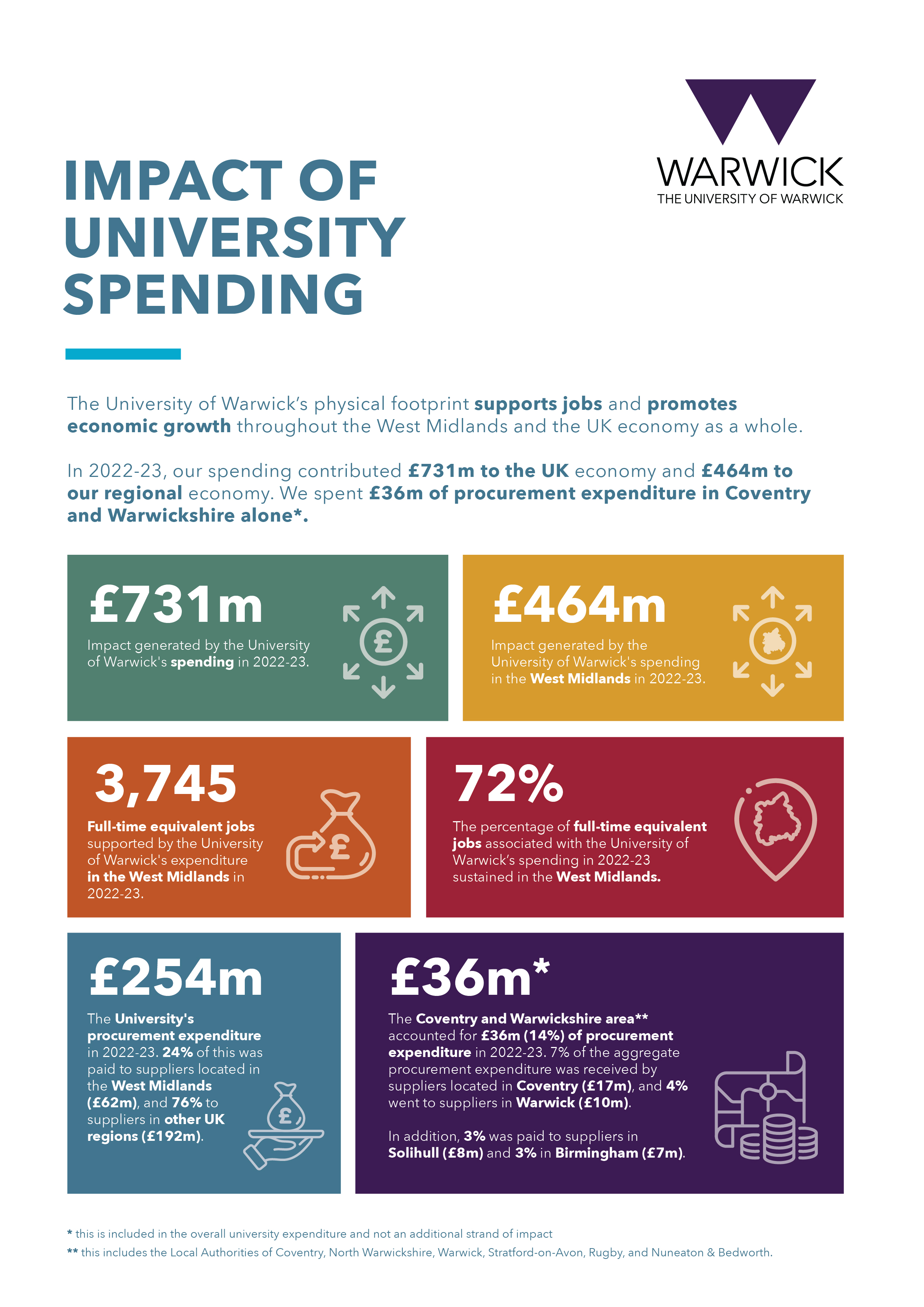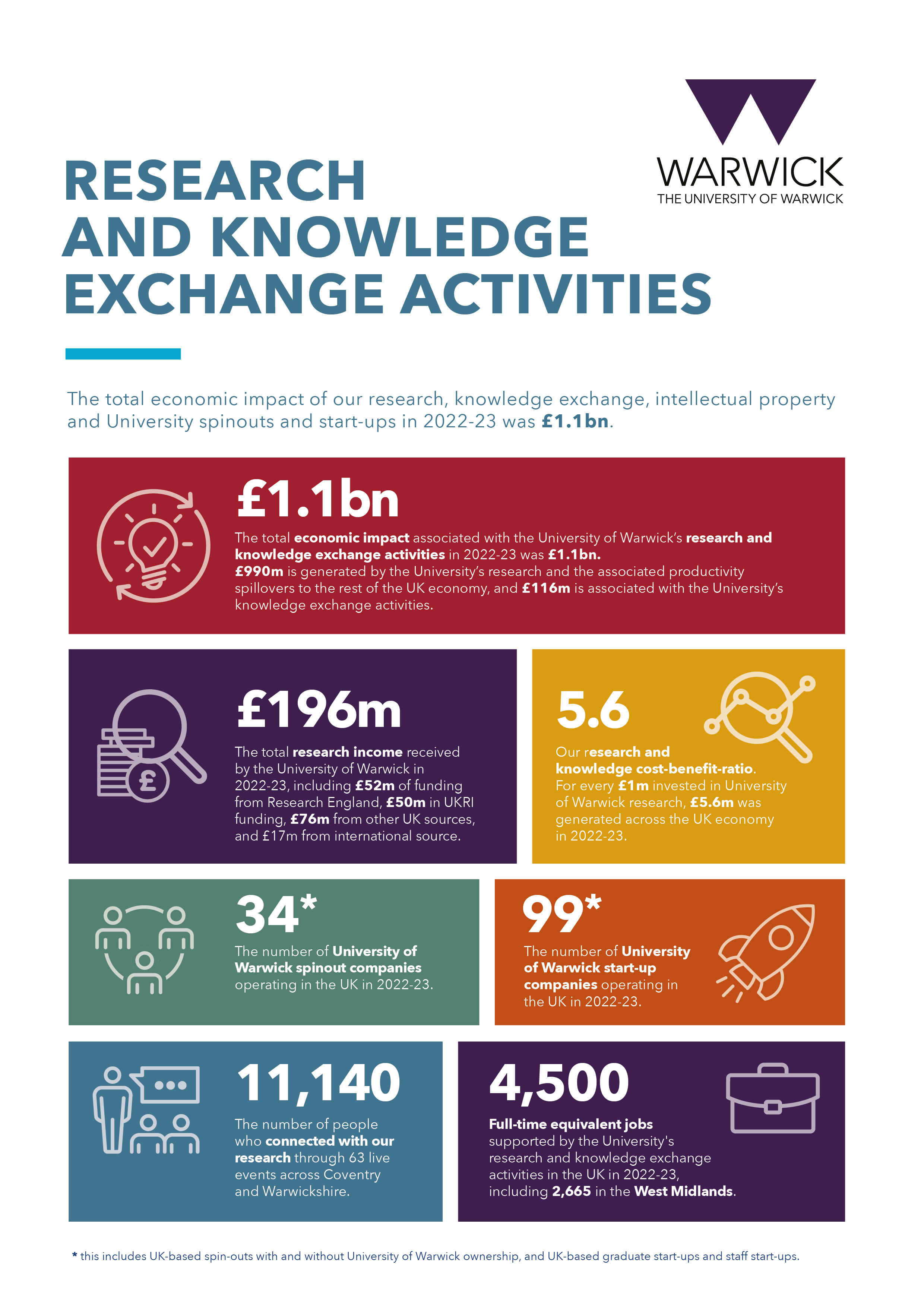 In 2022-23 the University of Warwick’s overall economic impact on the UK was  £3.8bn, an increase of 11% in real terms since 2016-17.