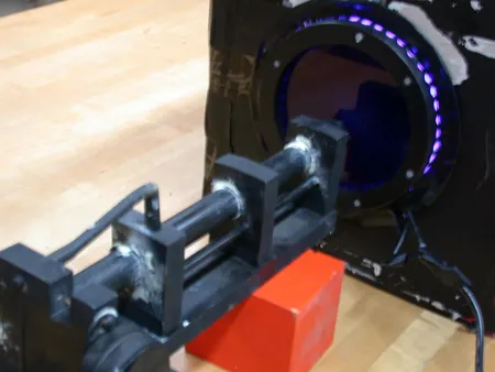 Figure 6: The apparatus showing the magnet location and the use of a stepper motor mounted on a PVC frame. Blue LEDs were used in this case.