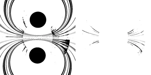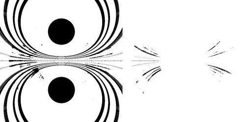 In Figure 9, two cube magnets are photographed. The first magnet on the left is aligned north-south and the second on the right is aligned south-north. This places different poles at the top and bottom of the image. Twisting helical lines are seen in the centre between the left and right magnets. Away from the centre, parallel contour lines are seen between all four poles.