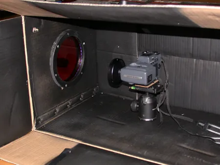 The still photographs were taken with a Nikon 995 digital camera and the movies with a CoVi CVQ-2110 security camera. The CoVi provided an excellent low light NTSC output that was captured onto our laboratory computer. The Nikon 995 is one of the better low cost cameras for scientific purposes because its exposure and focus settings are lockable during operation, providing a consistent series of photographs. We used a Nikon Wide Angle WC-E63 lens in order to gather as much light as possible. Our best still images came from an exposure setting of 8 seconds and a 4.6 F-stop.