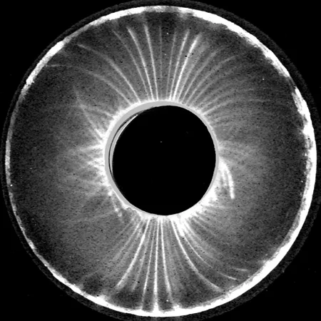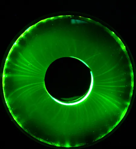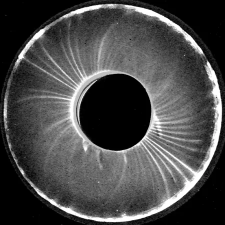 We seek to analyse the paths that the light follows when injected orthogonally into a ferrofluid Hele-Shaw cell (also referred to as “the lens” or “the cell” in this paper). Each cell is made of two circular, optically flat, windows of glass sandwiched together with a very thin layer of ferrofluid in between. Light is injected radially into the edges at regular intervals, as seen in Figure 1. We define the flat plane of the glass as the xy plane; the light was injected into the outside edges of the glass, and the pictures were taken by a camera on the z axis.