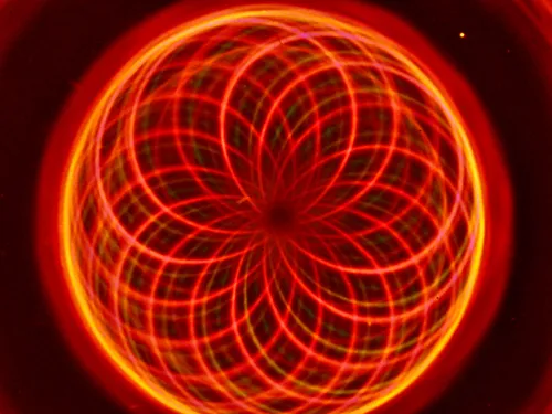 In Figure 12, there is a 50.8mm ring magnet with the north pole facing the camera. The repeating light pattern produces a nice spirograph. Upon further study, one should notice that each repeating shape is a ‘D’ shape with the straight part of the ‘D’ near the centre of the magnet and the curved part of the ‘D’ close to the inside diameter of the magnet. Using a green laser pointer, we have found that you could shoot the laser light near the inside diameter of the ring magnet and only get a single ‘D’ shaped light pattern. The apparent conjecture is much the same as in Figure 11; that left-handed and right-handed polarizations of light originate close to the inside diameter of the magnet and travel in different directions to the centre of the magnet forming a spirograph pattern.