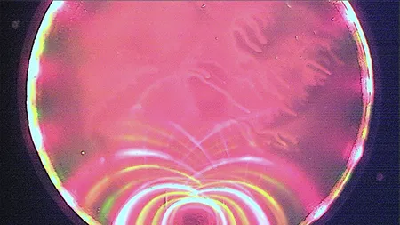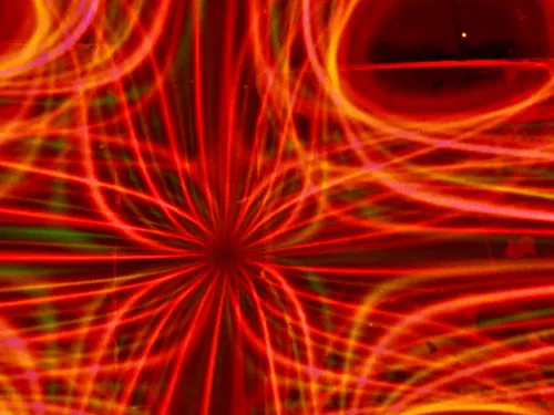 The illumination leads to two different colour response modes of the lenses. Starting at red wavelengths and working to green wavelengths, photons pass through the lens giving detailed dipole contour lines of the externally imposed magnetic field, as seen in Figure 3. The magnet is in the center of the lens with black paper around it.