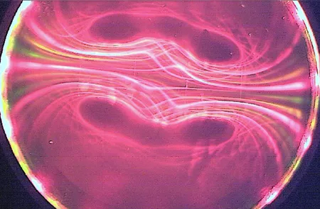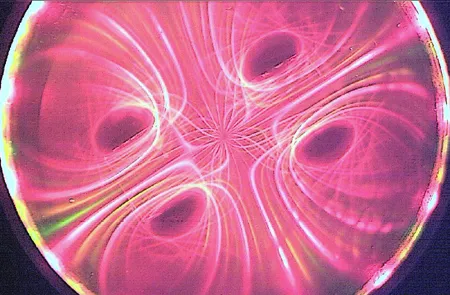 In Figure 8, the photograph is showing a different optical effect. A uniform white light source has been placed 30 degrees off the xz axis. The main light source is off screen, and behind and to the right of the cell. Three tesla rated magnets with the north poles facing the camera are photographed. The off axis lighting shows a helix structure between the poles. We believe that the narrowest point(s) of the helix between the north poles are related to Points of Inversion.