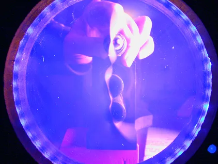 Figure 12: Photograph of a 50.8mm ring magnet with the north pole facing the camera with different colour LEDs around the perimeter of the lens.