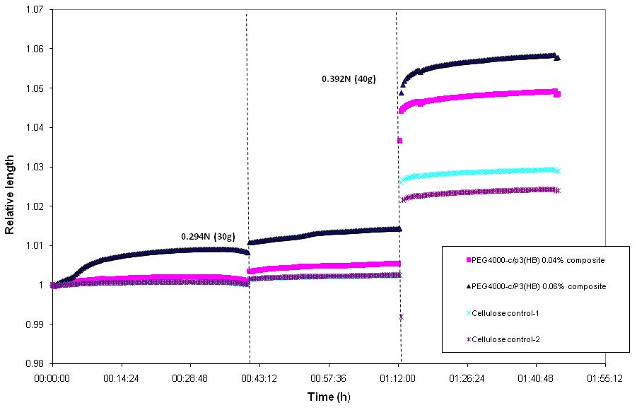 Figure 12: The temporal variation of relative length in modified cellulose and poly-3-hydroxybutyrate composite specimens undergoing uni-axial tensile testing at 0.294N (30g) and 0.392N (40g) loads