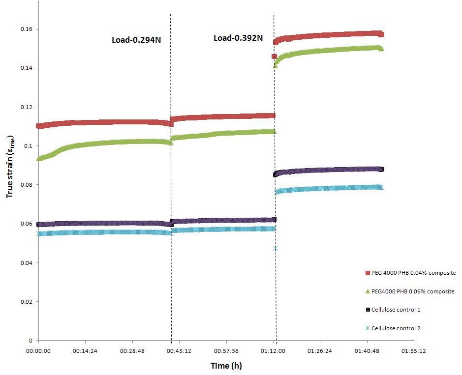 Uni-axial tensile testing suggests that composites exhibit more ductile properties compared to cellulose controls (figure 15). It is also evident that composites undergo irreversible deformation during tensile testing and hence exhibit plasticity rather than elastic behaviour under high stress (figure 14). In longer timescales under lower but constant stress, these composite materials can be expected to exhibit viscoelastic 'creep' deformation properties. Moreover, the novel composites can be expected to possess intermediate mechanical properties compared to its component polymers. This assumption can be supported by evidence visible in composite samples at hydrated state undergoing uni-axial tensile testing (figure 17). The composite polymer material clearly indicates more ductile behaviour compared to cellulose control and suggests that it is less brittle compared to cellulose. Furthermore, poly-3-hydroxybutyrate control can be seen approaching 'necking' stage under high load (0.784N and 0.882N) where more fluid behaviour can be observed (this indicates that the fracture of the sample is imminent). Whereas composite samples do not exhibit the same behaviour as poly-3-hydroxybutyrate control under high loads (figure 16). Therefore this suggests that cellulose fraction included in the composite biopolymer elevates the load bearing capacity of the material when compared to poly-3-hydroxybutyrate component polymer.