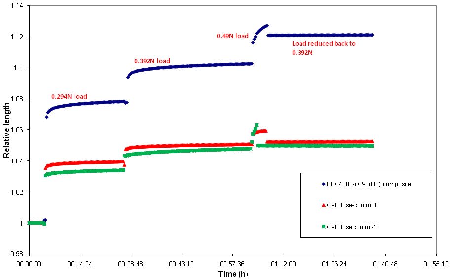 Uni-axial tensile testing at hydrated state indicates that composites (and cellulose controls) indicate increased ductile behaviour compared to dry state. Even under a high load such as 0.882N, the material is capable of undergoing deformation while maintaining its integrity. However, the poly-3-hydroxybutyrate control indicates more fluid behaviour under high load (0.784N and 0.882N) suggesting that it is undergoing 'necking' and close to fracture (figure 17). The 'necking' effect can be clearly observed in composite polymer specimen at dry state under high (0.49N) stress (figure 16) where the relative length increases exponentially during 'necking' stage indicating the imminent fracture of the specimen. A significant increase in relative length in composite samples at hydrated state compared to samples at dry state can be observed (relative lengths 1.06 compared to 1.10 under 0.392N-figures 12 and 17). The same observation is notable regarding cellulose controls at dry state and hydrated state. This suggests that increased extensibility and more ductile behaviour observed in samples at hydrated state are almost exclusively given by the cellulose fibre fraction included in the composites. A possible explanation for this tensile behaviour could be the fact that cellulose fibre fractions in composite specimens are capable of trapping and retaining water molecules, resulting in more ductile and viscoelastic behaviour in hydrated specimens.