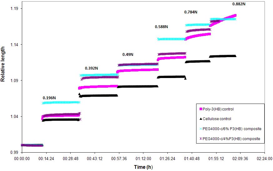 The mechanical properties of composite polymer samples were evaluated using a constant load extensiometer as described by Thompson (2001). If the specimens tested were at hydrated state, de-ionised water was added to sample chambers in order to maintain the hydrated state.