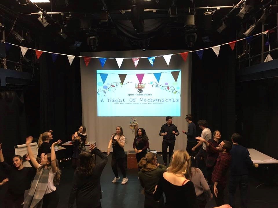 [Image shows the group doing a dance warm-up to Queen's Don't Stop Me Now (photo from the QMUL Shakespeare Society Facebook events page)