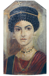 In the National Museum of Scotland, Edinburgh, is a mummy portrait of woman from Roman Egypt. This portrait was discovered in 1911 by renowned Egyptologist William Flinders Petrie when excavating in Hawara, Egypt. The subject of the portrait is a woman who wears her hair in an elaborate and fashionable Roman hairstyle and is bedecked in jewellery, both of which can be used to date the portrait to 110-130 AD. The portrait is painted on a wooden panel and would have been positioned over the face of a cartonnage body case, as we find, for example, in the Mummy of Artemidorus in the British Museum. This and a large selection of other painted Egyptian mummy portraits are rare and fantastic examples of preserved painting from the ancient world, a wonderful consequence of the Egyptian archaeological context so conducive to the preservation of organic material.