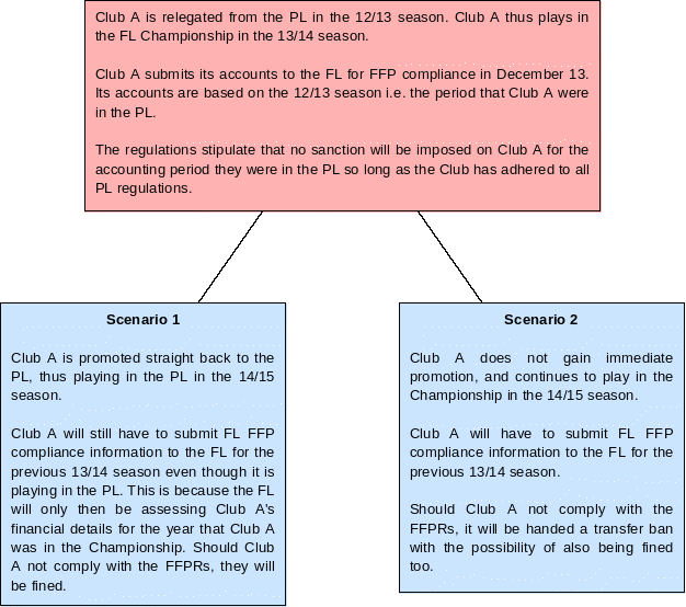 | One of the biggest hurdles for the FL to resolve was the relegation/promotion conundrum (i.e. PL clubs relegated the Championship and the clubs promoted to the Championship). As will be set out below, accounts will be required for FL compliance. It would have been a very brave regulator to sanction clubs for breaching the FFP regulations for accounting periods when a current Championship club was outside of the FL Championship. To their credit the FL have come up with innovative solutions that will be set out below. |