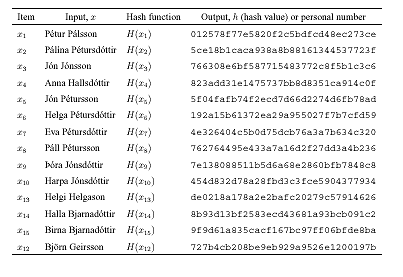 When the Act on a Health Sector Database refers to one-way coding as the transformation of words or series of digits into an incomprehensible series of symbols which cannot be traced by means of a decoding key, it seems to be based on a protocol such as this hash function. A repeated one-way coding would take the output of the first hash function as an input for the second and so on. One can take MD5 (Message Digest 5) as an example of a hash function for such one-way coding. MD5 will take a message of any length and 'digest' it to produce a 128 bit 'fingerprint'. Functions such as MD5 are generally used for electronic signatures of documents. I shall use it here to make an example look-up table, a key made with one-way coding.