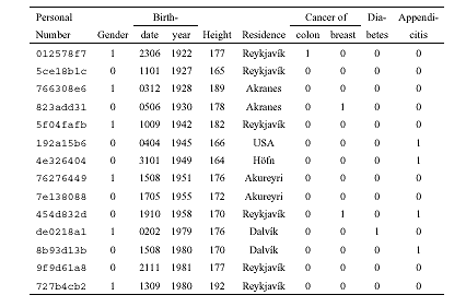 As an example take the identity numbers of individuals that have been coded either with a one-time-only encryption function or a one-way hash function as described above. Attached to this personal number is general information such as gender, birth date, year of birth, height, town of residence as well as health information of varying sensitivity. Examples could be operation for appendicitis, cancer of the colon or cancer of the breast, or diabetes (Table 4). More sensitive information, such as on venereal or mental disease, also might be included.