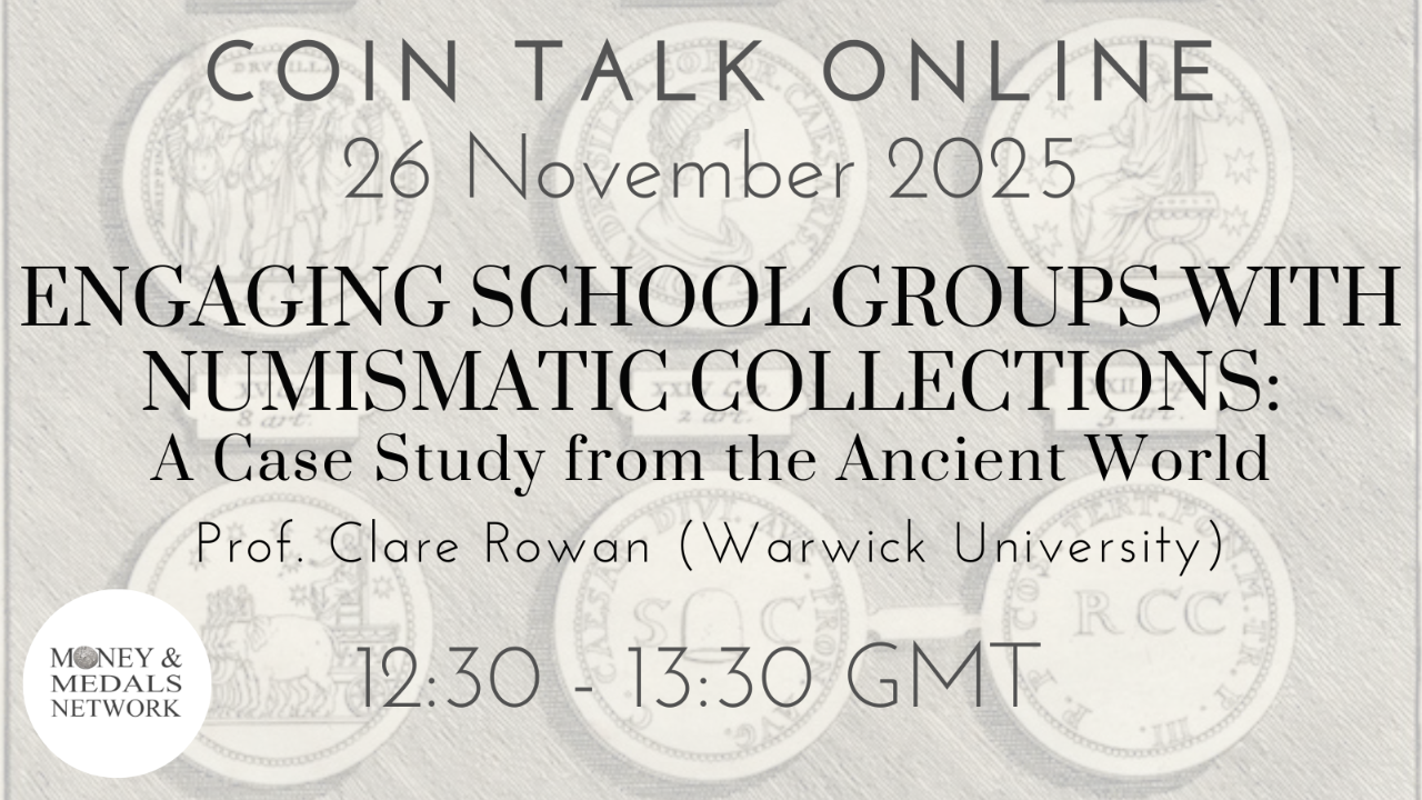 The theme for this session is 'Engaging school groups with numismatic collections: a case study from the ancient world' by Dr Clare Rowan (Warwick University).