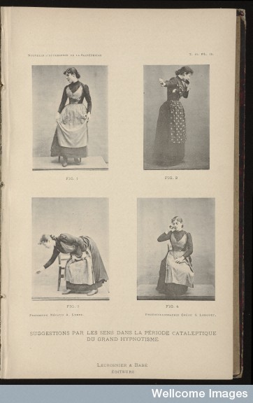 In 1891, the photographer of La Salpêtrière Albert Londe recorded the experiments that Georges Guinon and Sophie Woltke carried out on the face of hysterical women under hypnosis. In line with other experiments, Guinon and Woltke aimed to test the influence of different sensorial excitations over gestures and facial expressions. Four years later, Londe collaborated with Paul Richer in the production of chronophotographic series on the physiology of movement. Three of these series portrayed the “expressive gait”, that is, the external manifestations of the passions in the moving muscles. Also during these years, Londe started taking photographs of actors rehearsing and on stage. Most of the times, the pictures were part of his experiments with artificial lighting in indoor theatres. His aim was to seize, in poor light conditions, the natural gestures of actors –a real challenge at the time.