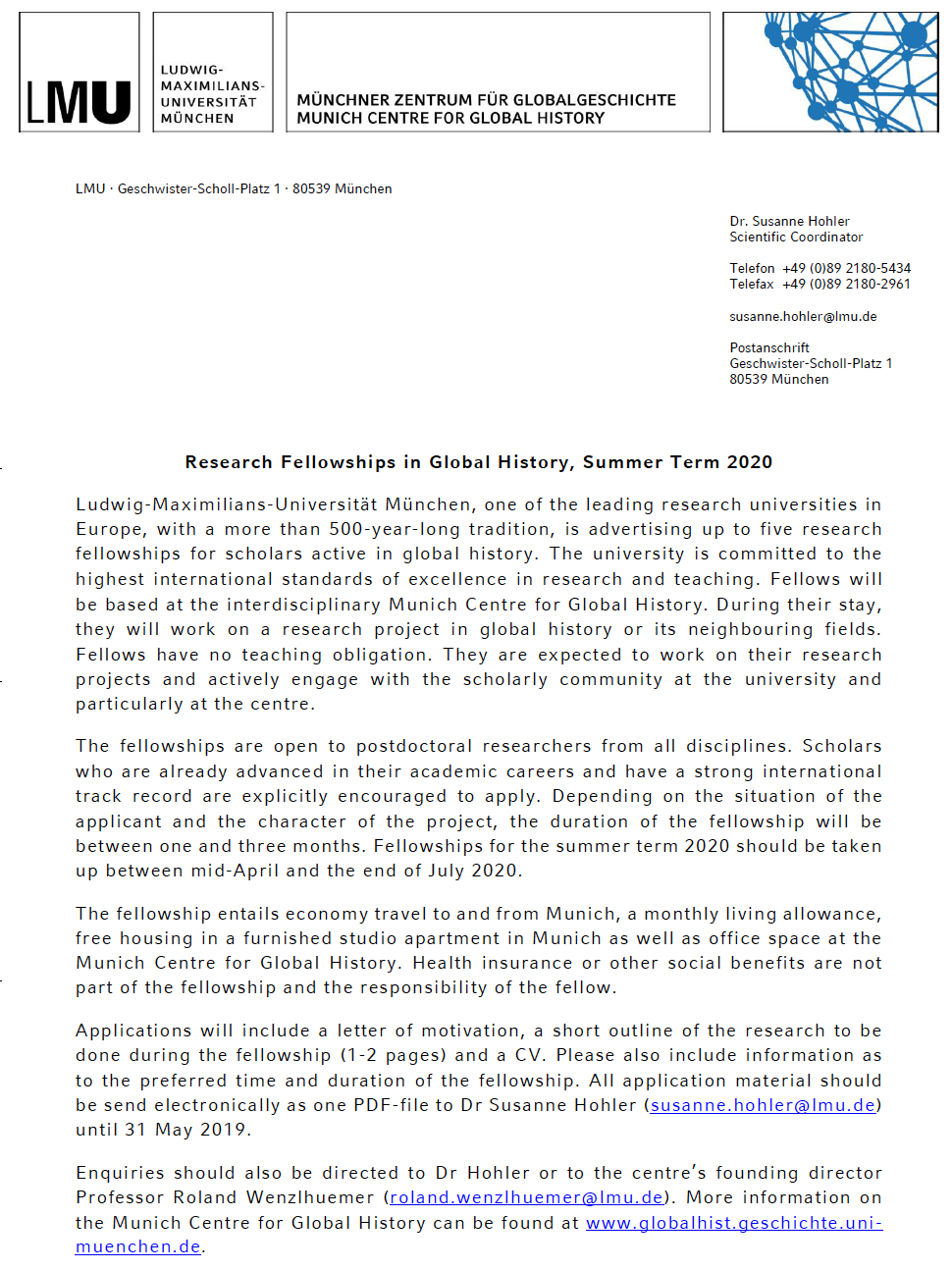 The Munich Centre for Global History is advertising research fellowships for the summer term 2020. The fellowships have a duration of between 1 and 3 months and can be flexibly timed within the winter term. The call is open for postdoctoral researchers. They particularly encourage experienced colleagues in the field of global history to also consider applying.