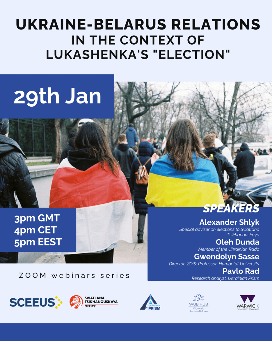 The Warwick Ukraine-Belarus Hub convened its webinar 'Ukraine-Belarus Relations in the Context of Lukashenka's "Election"'. The speakers were: Alexander Shlyk, special adviser on elections to Sviatlana Tsikhanouskaya; Oleg Dunda, a member of the Ukrainian parliament; Gwendolyn Sasse, director of the Centre for East European and International Studies (ZOiS); and Pavlo Rad, research analyst at Ukrainian Prism. Recordings of all webinars in the series are available on our website here.