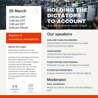 The Warwick Ukraine-Belarus Hub convened its webinar 'Holding the Dictators to Account'. The panellists were: Kateryna Rashevska, a lawyer from the Regional Centre for Human Rights; Guillem Cano-Palomares, deputy head of the Secretariat of the PACE Committee on Legal Affairs and Human Rights; Anais Marin, the United Nations Special Rapporteur for the Situation on Human Rights in Belarus; and Kanstantsin Dzehtsiarou, Professor of Law at the University of Liverpool. A policy paper based on the webinar event will be published in due course.