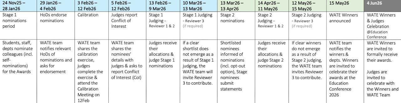 Upon judge recommendation, the WATE team assigns judging roles as Reviewer 1, Reviewer 2, or Reviewer 3 (an experienced judge who steps in if needed). They are organised into faculty-based teams to reflect disciplinary expertise. Note that judges will not review nominations from their own department, and all allocations are checked for conflicts of interest.