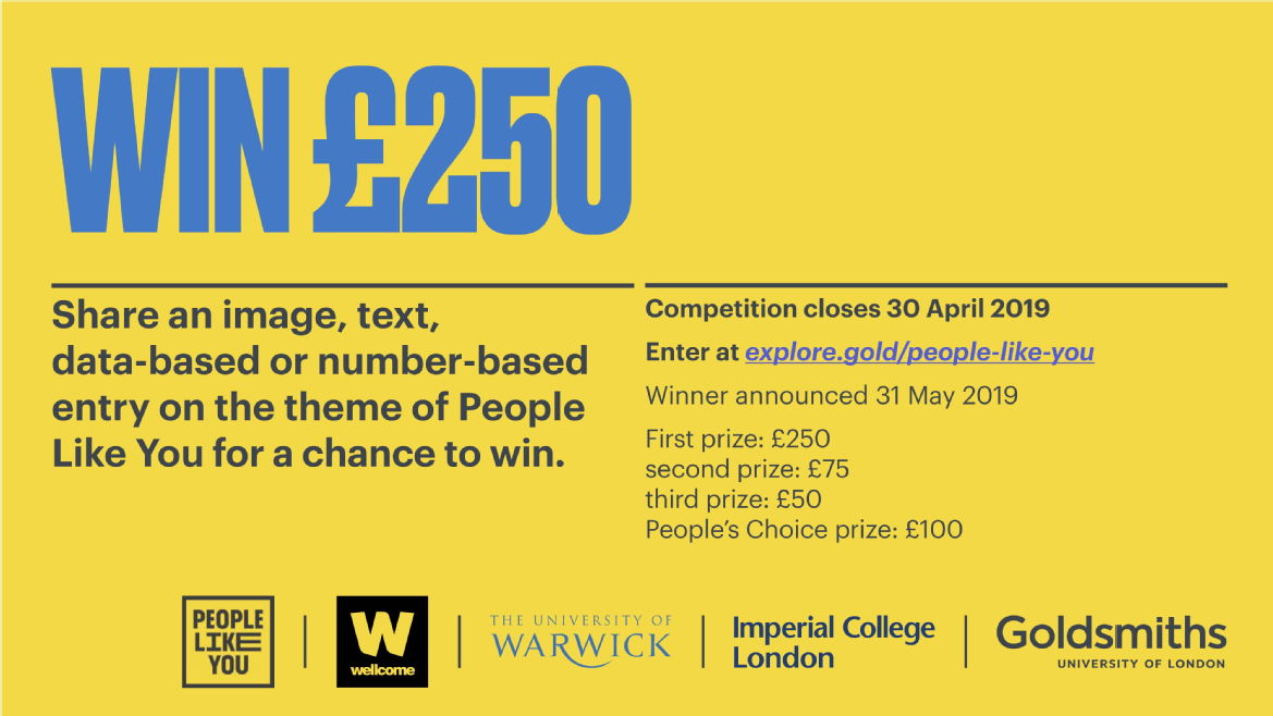 The People Like You project is running its first online competition. Win cash prizes for submitting entries (image/text/numeric) on the theme 'People Like You' https://competitions.peoplelikeyou.ac.uk/who-are-people-like-you/ … #PLYcomp #personalisation (Deadline: 30 April)” @personalisePLY