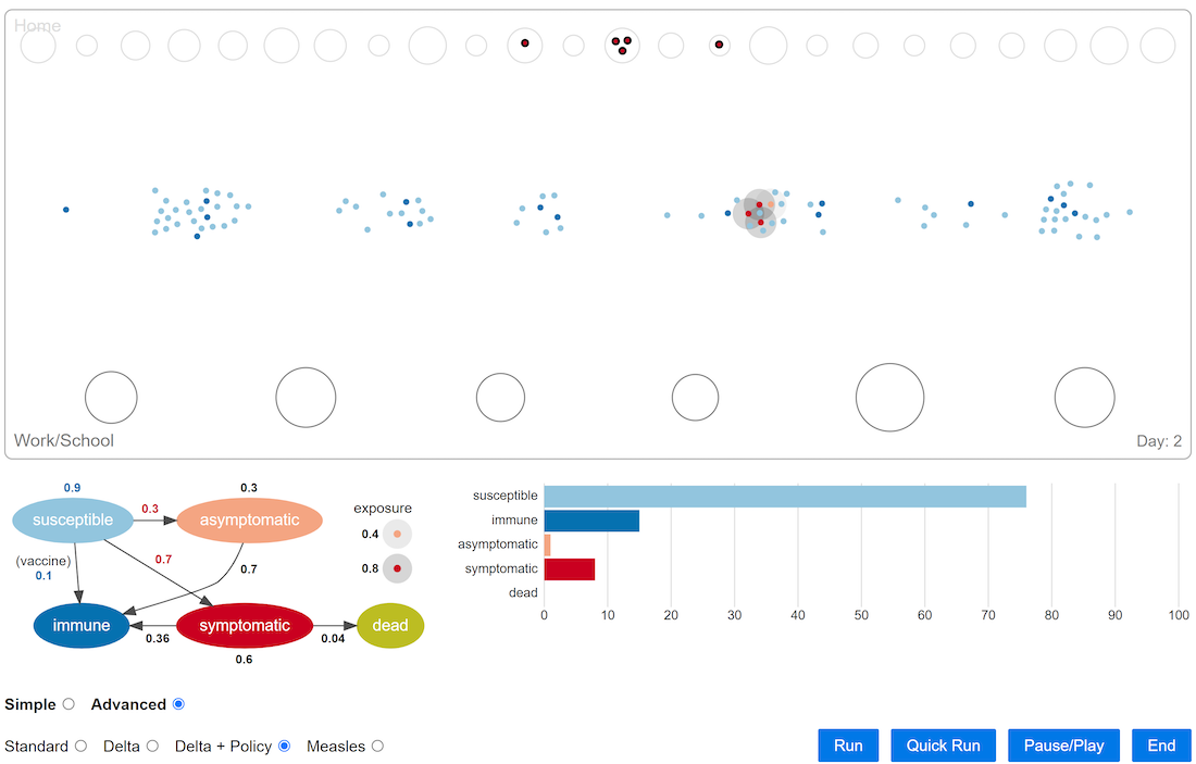 Within the workshops, children first listened to a presentation on how diseases spread and how probability helps to understand some of the dynamics. They then take part in a physical activity involving rolling a dice and throwing a string to peers to experience disease spread in a playful way. The workshops then switched to a "digital" activity where children interact with our interactive simulation and data visualisation tool, Particle People, to experiment how a disease spreads in a small, simulated town. They were able to play with the parameters of the simulation, introduce public health interventions, such as isolation in place and vaccination, to curb the spread of the disease. They also had the option to create different scenarios involving a range of viruses with distinct capacities and dynamics to spread (eg., by setting the infamous R-value). Once they interact with the tool, they then switch to a closing presentation to get them reflect on what they have observed.