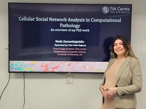 Neda’s thesis, titled “Cellular Social Network Analysis in Computational Pathology”, introduces Cell Social Network Analysis (CSNA), an interpretable framework that models cellular interactions in histopathology using principles from social network analysis. CSNA achieves state-of-the-art performance in colorectal cancer grading and biomarker prediction, both as a standalone method and when fused with deep learning, while remaining computationally efficient.