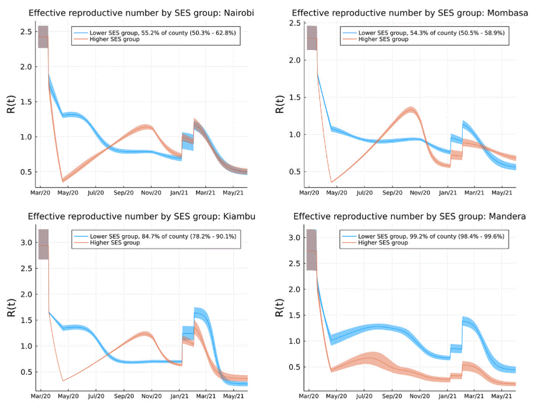 We found evidence that in urbanised regions of Kenya, characterised by high-density informal settlement, the risk of infection during the first wave in Kenya was extremely high among people in lower SES groups with very low ascertainment of infection by PCR testing. Subsequent waves in Kenya are explained by the delayed infection of people among higher SES groups who could maintain higher levels of social distancing for longer, and the introduction of highly transmissible variants of concern: Alpha, Beta and, more recently, Delta variants.