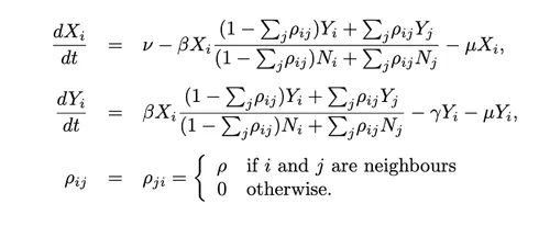 For a disease with SIR-type dynamics and “commuter-like” interaction terms,the governing equations become: