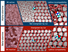 Ice binding proteins have been widely studied, and we have a large research program into macromolecular (polymer) cryoprotectants. There has been less work on the study of small molecules which can modulate ice formation and growth, however. In our latest work with the Sosso GroupLink opens in a new window we show that simple amino acids can reduce ice recrystallisation. L-alanine could inhibit, whereas beta-alanine did not. Modelling suggests incompatability with the ice lattice explains the activity, rather than intrinisic ice binding affinity. This work shows that the design and discovery of small molecules to control ice growth is possible.