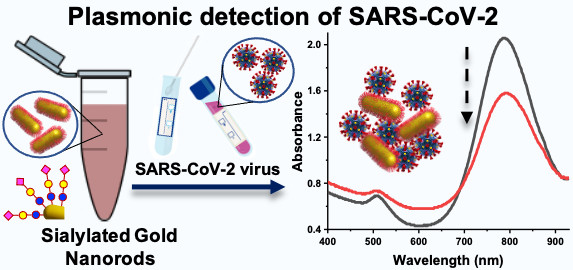 Working with colleagues at UHCW, we have demonstrated the detection of SARS-COV-2 virus using liquid samples. Our team in 2020, discovered that SARS-COV-2 spike protein could bind sialic acids Link opens in a new window(specialised sugars) and developed this for lateral-flow and flow-through detection as the first example of a glyco-assay, Link opens in a new windowrather than more established anti-body based detection. In this present work, the team show a solution-phase assay which can be conducted in multiwell plates and is hence suitable for automation. The key design of this was rod-shaped gold nanoparticles, with a synthetic polymer tether connecting the sugars. The rod-shaped particles' longitudinal SPR band is very sensitive to binding changes, and at 800 nm, is not subject to interference from e.g. background media. We showed function using a recombinent spike protein (the N-terminal domain specifically) and also using primary swab samples.