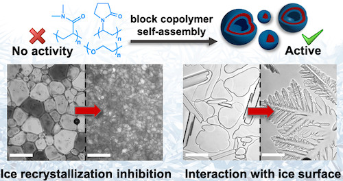 We have a major research interest in how we can develop new materials, inspired by extremophiles, which can bind or modulate ice growth and also macromolecular cryoprotectants to protect cells/proteins from cold damage. A key challenge is that discovering new materials which affect ice growth is challenging (compared to the well known ice binding proteins). In our latest paper we report that polymer nanoparticles, derived from PISA (polymerization-induced self-assembly) had the surprising property of preventing ice recrystallization (growth). What was surprising was that the coronal polymer (water soluble outside parts) alone had no activity, but in the PISA particle format showed a remarkable enhancement, with larger particles being more active than small. One polymer, polyvinylpyrrolidone, appear to bind ice crystals when in particle format, which has not been previously reported. The results are really exciting as these are really very easy to synthesise and a huge range of monomers and particle morphologies can be accessed and will let us explore these properties. We also showed these polymers do not nucleate ice formation, as few materials do. This was important as large assemblies of ice binding proteins have been shown to nucleate ice, but that was not seen here.