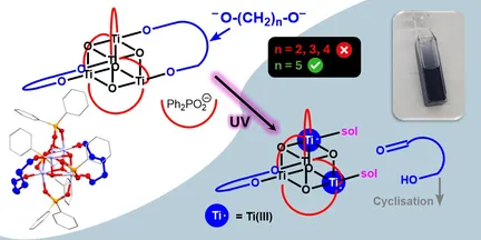 By designing Ti-oxo cluster molecules with diolate ligands, we can investigate photoredox reaction mechanism in detail. We find that the diolate must be sufficiently large and flexible to facilitate a crucial proton-coupled electron transfer step in a photoredox process. In the case of a pentane diolate ligand, the ligand is selectively oxidised at one end to make the correpsonding hydroxyaldehyde, which cylises to a lactol form.