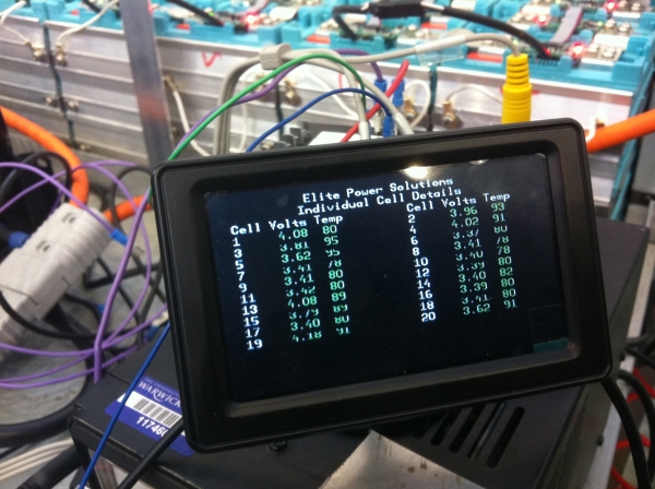 Before taking the components over to the International Automotive Research Centre (IARC), the batteries are charged up with the Battery Monitoring System (BMS) displaying the real-time conditions for each cell.