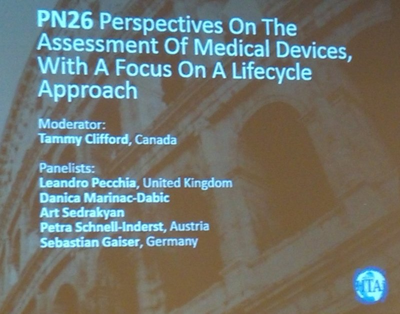 The moderator, Tammy, provided a brief reminder of the problem: what is the technology lifecycle, why does it differ for medical devices (vs drugs), and why HTA of medical devices has fallen short. This will set the stage for the subsequent presentations.