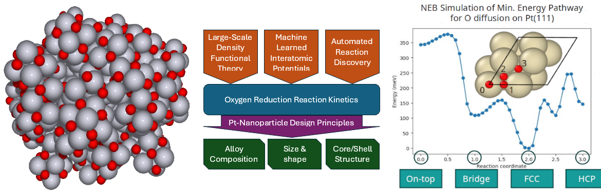 This project uses cutting-edge computational and machine learning methods to accelerate catalyst discovery for fuel cell technology.Hydrogen fuel cells can produce clean electricity from hydrogen and oxygen, but their performance and cost are limited by platinum-based catalysts. This project will use advanced computational methods to accelerate the discovery of better catalysts that use less platinum and have improved long-term stability.By combining large-scale density functional theory with machine-learned interatomic potentials and automated reaction discovery, we will reveal how nanoparticle composition, geometry and electronic structure govern electrochemical reaction rates, helping design efficient, low-cost materials for sustainable hydrogen technologies.