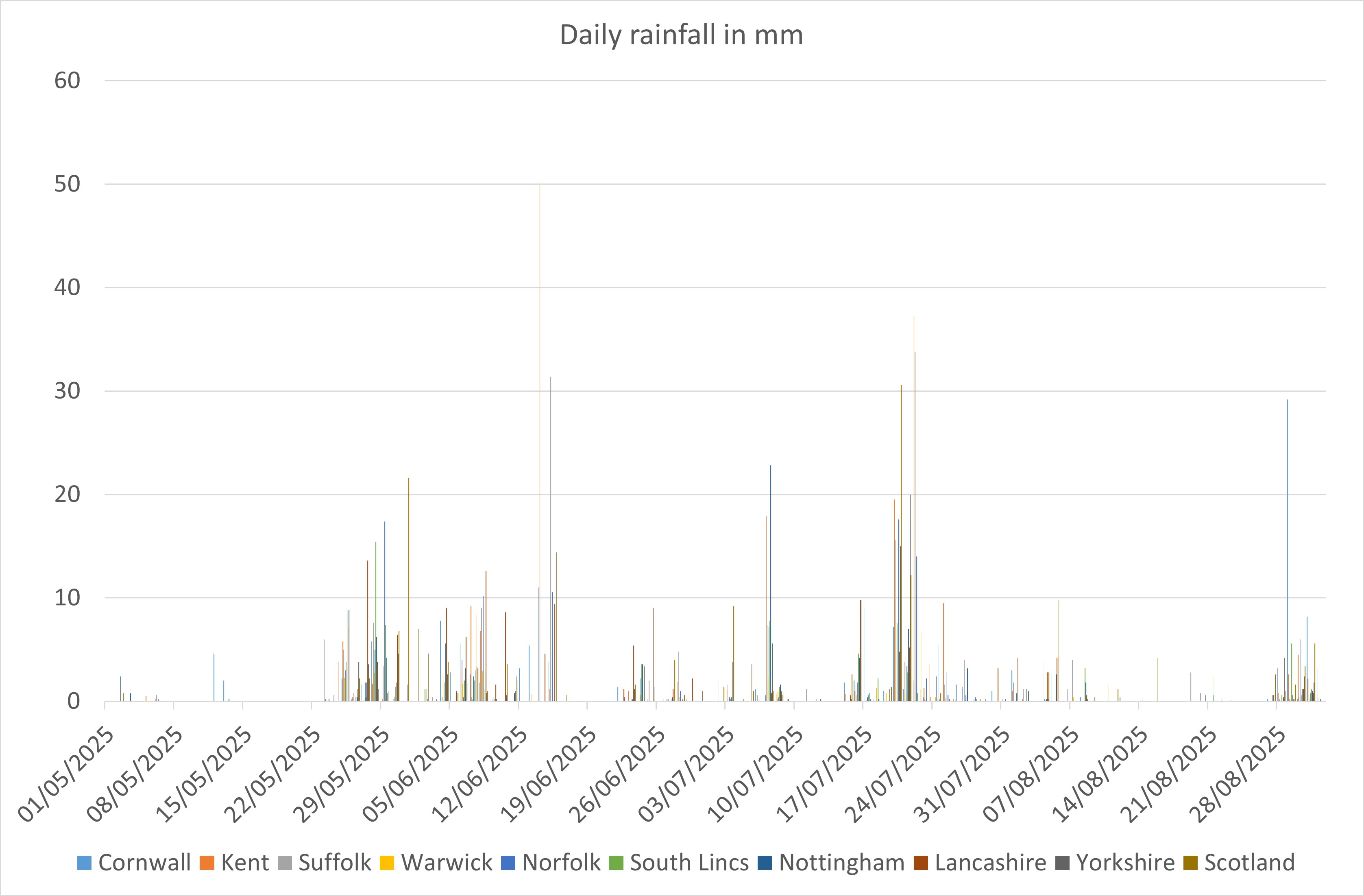 The graph below summarises daily rainfall from 1 May for the sites for which we receive weather data from Agrii.