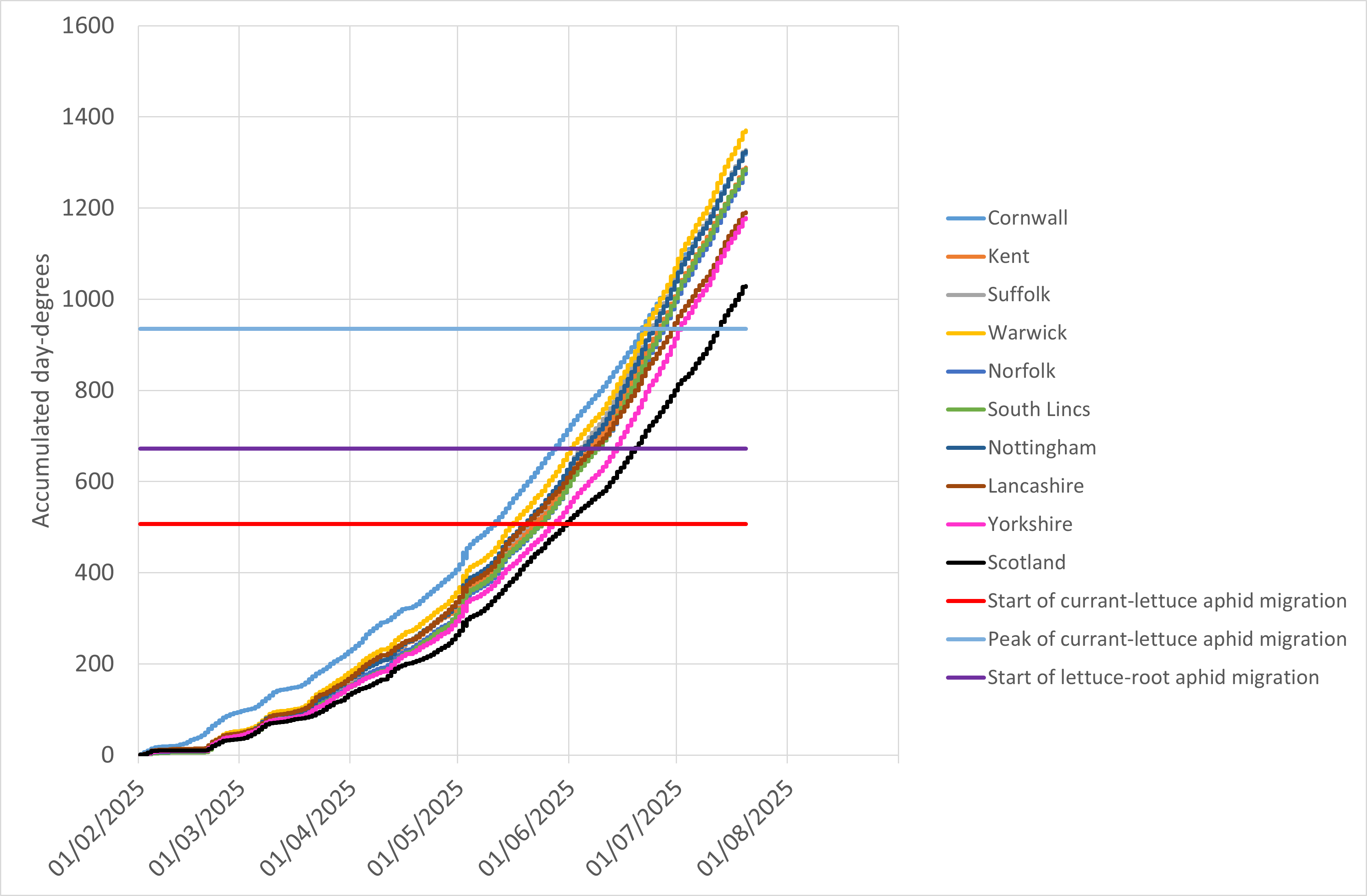 The graph above shows ‘day-degree forecasts’ for currant-lettuce aphid (Nasonovia ribisnigri) and lettuce-root aphid (Pemphigus bursarius). The forecasts for both aphid species are based on accumulated day-degrees (D°) from 1 February (base 4.4°C). The information was collected in projects funded by the AHDB, Defra and LINK.