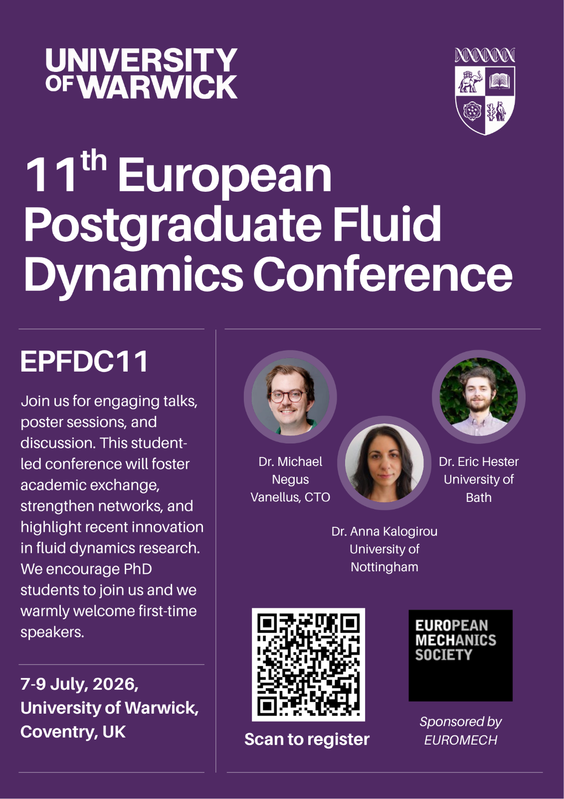 The 11th edition of the European Postgraduate Fluid Dynamics Conference (EPFDC11) is coming to Warwick in 2026 - the first instalment in the EPFDC since 2019 and the Covid-19 pandemic.