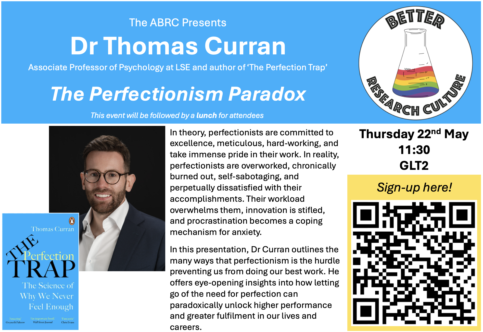The ABRC are excited to welcome Dr Thomas Curran, Associate Professor of Psychology at LSE and author of ‘The Perfection Trap’, in a discussion about perfectionism.