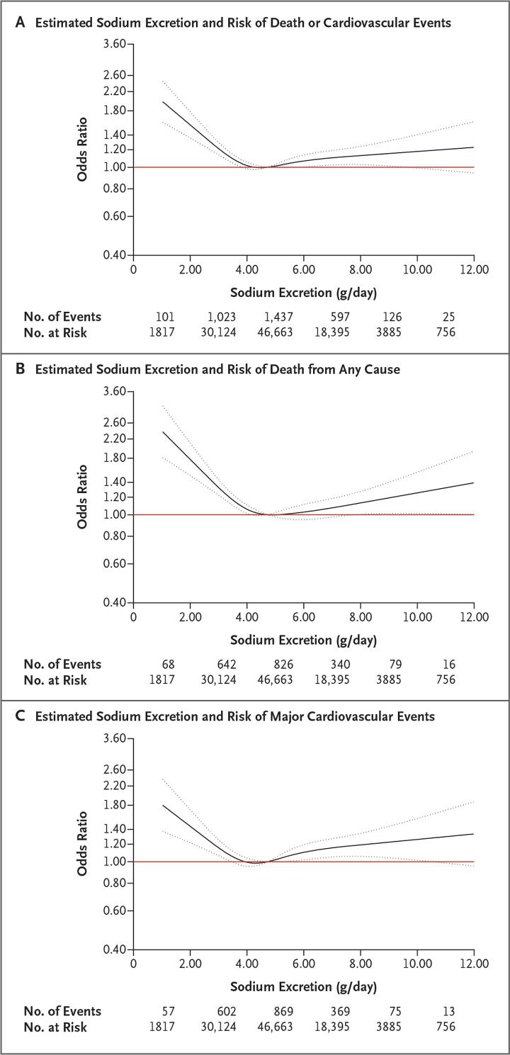 from estimated 24h urinary sodium excretion calculated with the Kawasaki formula applied to a morning fasting urine sample. They recorded all-cause and major CV deaths for a mean follow-up of 3.7 years. A composite outcome occurred in 3,317 participants. There was a J-shaped association between estimated sodium excretion and CV events: a higher estimated sodium excretion of >7 g (>17.5 g of salt) per day was associated with increased risks of death and major CV events, with a stronger effect among people with ‘hypertension’. On the other hand, an estimated sodium excretion that was below 3 g (7.5 g of salt) per day was also associated with an increased risk of the composite outcome.