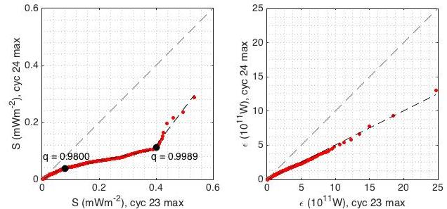 Caption to figure: Figure 1: Quantile-quantile plots of two measures of the solar wind energy (the Poynting flux (left) and ε parameter (right)) comparing their statistical distributions between successive solar cycle maxima. For each parameter, two distributions are calculated using data collected during the two solar cycle maxima. Each point on the graph then exceeds the same proportion of data in both distributions, for example, the q=0.9800 point is the value in each data set which is higher than 98% of the data in that set. Straight lines denote ranges where the type of distribution doesn’t change; the slope and intercept of the line tell you how the distribution shape changes between the two solar maxima. The Poynting flux plot splits into three linear regions, whereas one is sufficient for the ε parameter, indicating ε is less sensitive to changes in the distribution of its extreme values.
