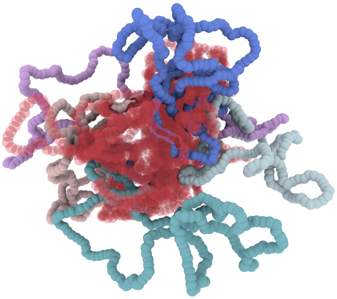 Ring polymers interpenetrate and “pin” one-another’s motion. To what extent do concentrated solutions, or melts, of ring polymers thread through one another at equilibrium? An analogous system is a well-shaken bucket full of very long rubber bands. If one attempts to withdraw a single rubber band it is very likely that a large tangle of interpenetrating rubber bands will instead emerge. This is to be contrasted with an attempt to withdraw a single strand from a bowl of freshly cooked spagetti, analogous to a system of linear polymers.