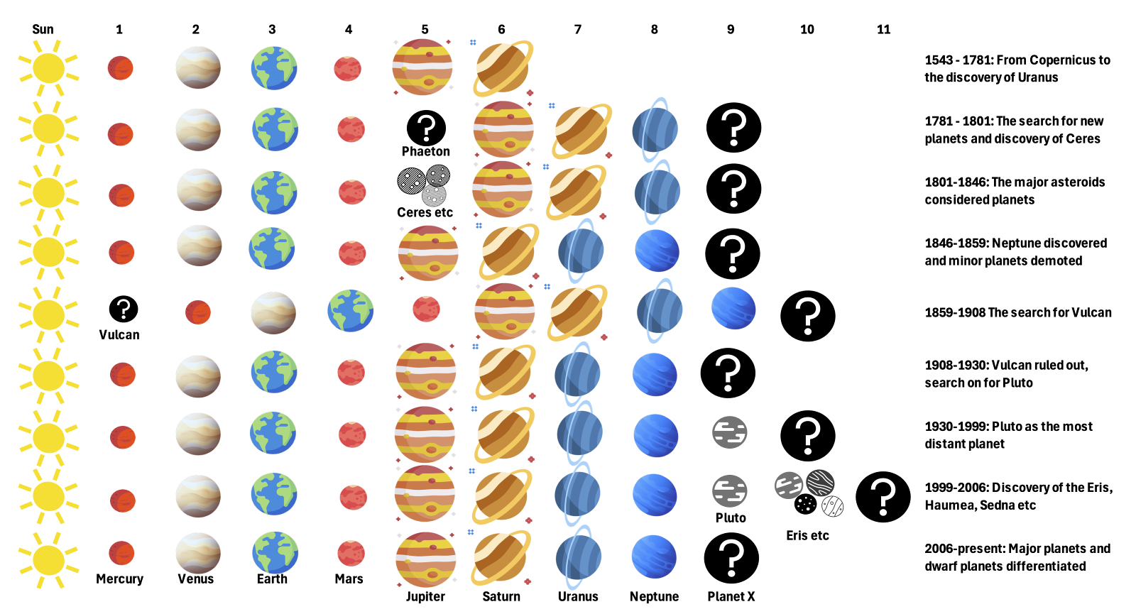 [Image: graphic showing the planets of the solar system, as known or hypothesised at different times. Uses icons from FlatIcon. Click to expand.]