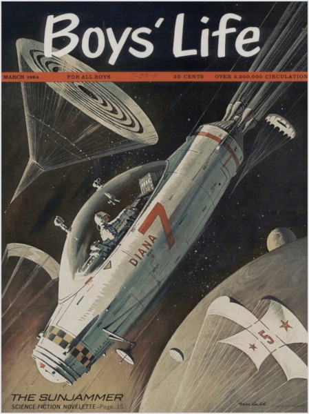 The other Sunjammer was published by Arthur C Clarke in Boy’s Life, March 1964, and was renamed The Wind from the Sun in its many subsequent publications to avoid confusion with the Anderson title. This focussed less on routine cargo transport and more on a solar-sail yacht race around the Solar System for a technology still in the demonstration stage. The vessels here are much more compact and light-weight versions of the solar sail concept, designed to carry crews of one or two and no cargo, but gaining speed and manoeuvrability as a result. The story’s drama builds as the various one-off ships in the race encounter technical difficulties and drop out.