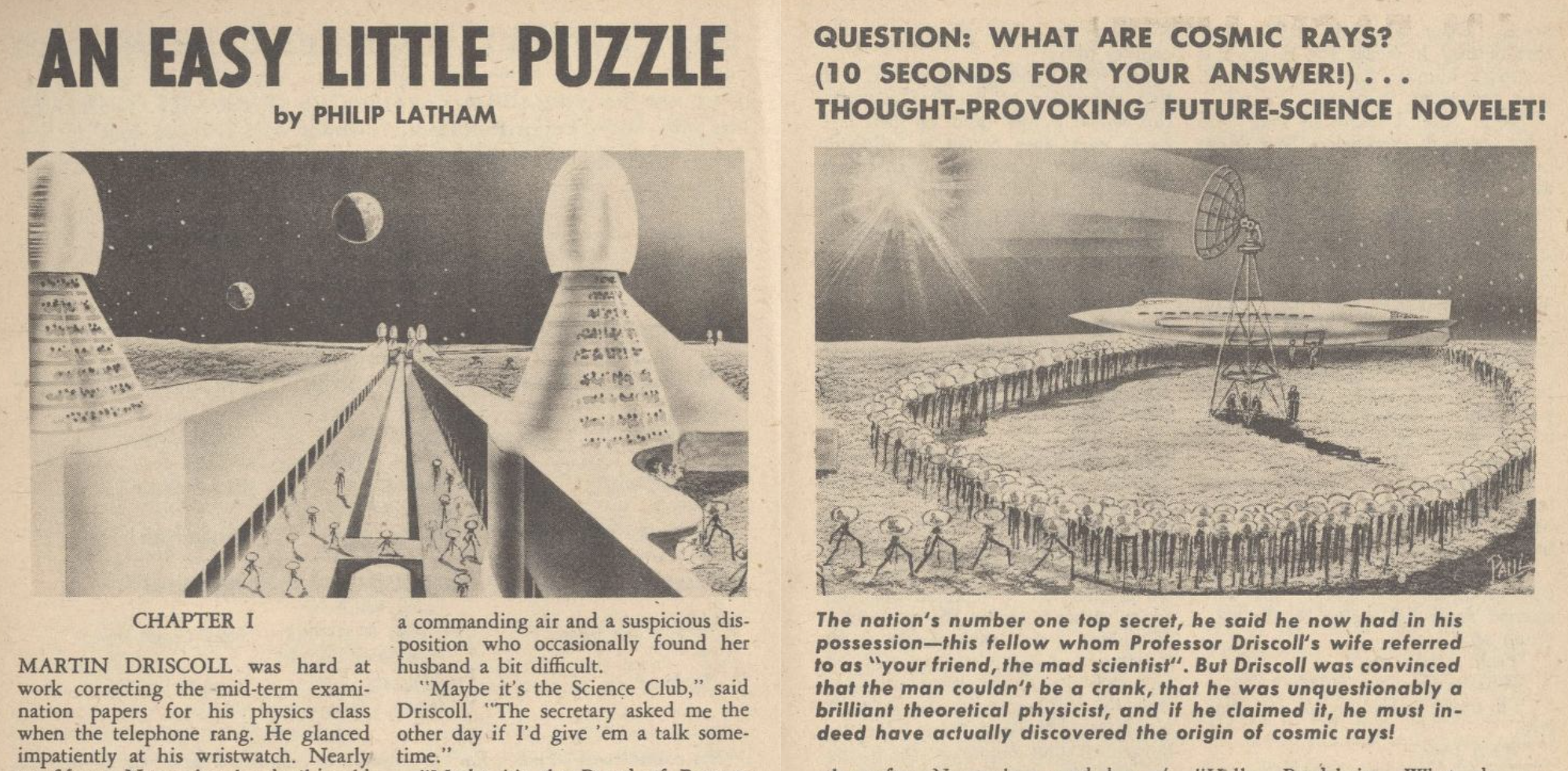 The story focuses on Driscoll’s attempts to finally solve the problem of cosmic rays after his old mentor dies suddenly, leaving him a cryptic clue. After a visit to the government’s chief scientist, and to researchers at Mount Palomar, it becomes clear that the entire edifice of the mainstream body of research and investment had been founded on a misconception.