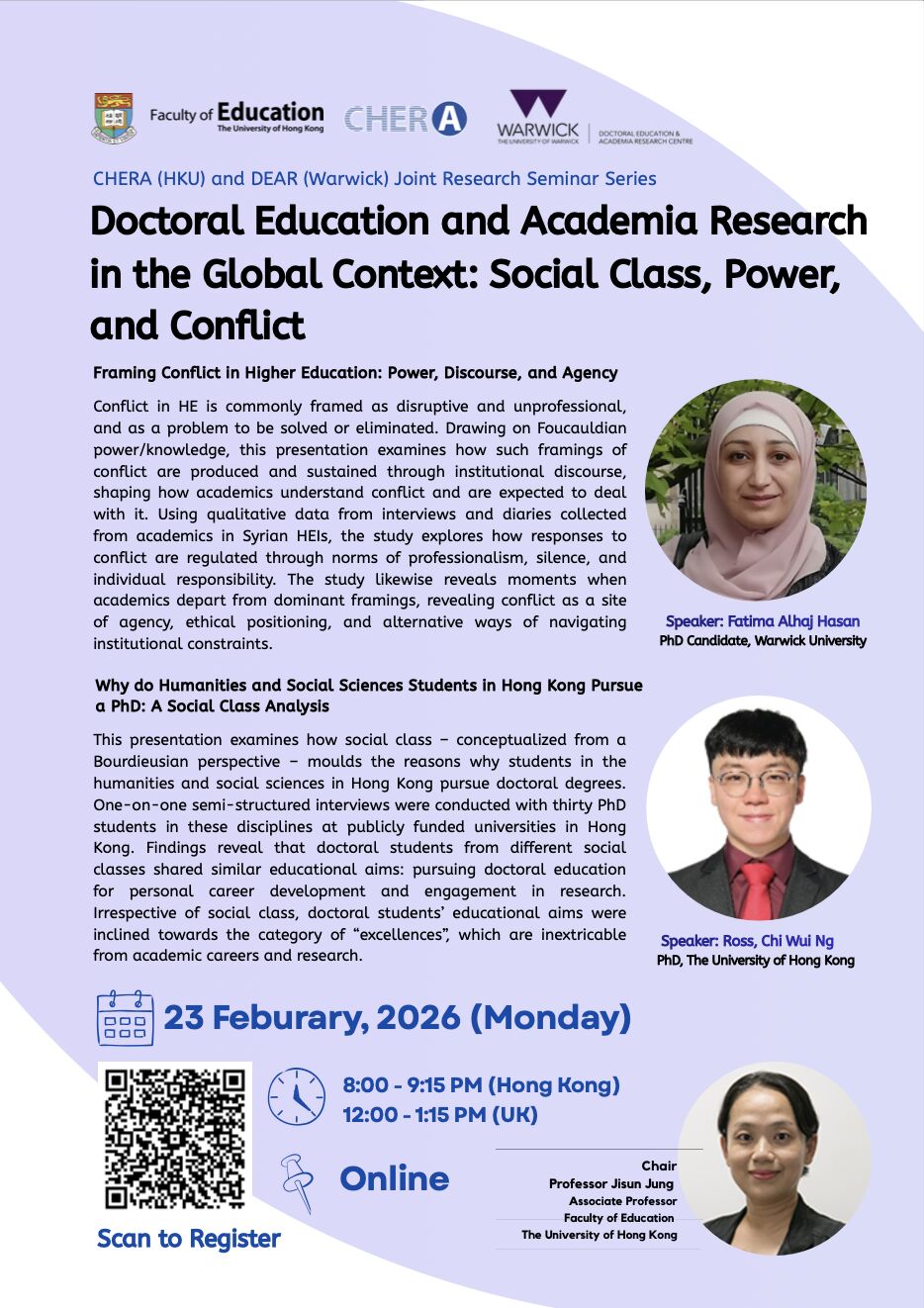 The Consortium for Higher Education Research in Asia (CHERA) based at The University of Hong Kong (HKU) Link opens in a new windowand the DEAR Centre) are thrilled to be collaborating on an upcoming online seminar chaired by DEAR Advisory Board member Professor Jisun Jung. This seminar will include a presentation from DEAR doctoral and postdoctoral group member Fatima Alhaj Hasan.