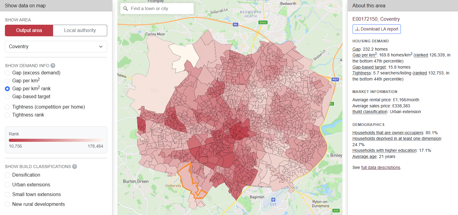 Providing geographically detailed results on excess housing demand and how to meet it at national, local authority and neighbourhood level, the tool draws on data from 20 billion housing searches together with a full history of sales and rental listings from 2019–2024.