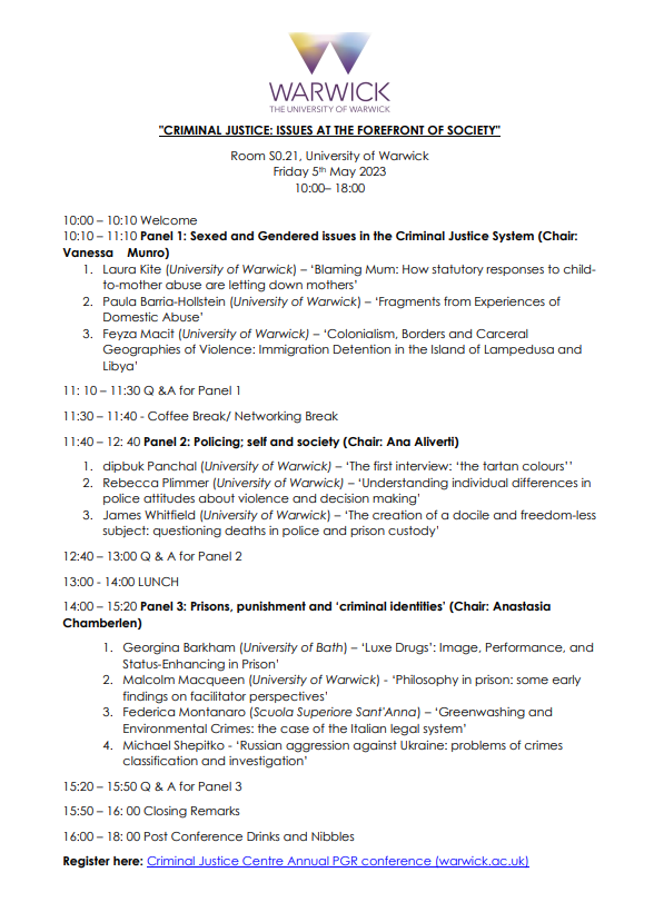 The Criminal Justice Centre is delighted to announce the Warwick CJC PhD conference, ‘Criminal Justice: Issues at the forefront of Society’. This one-day conference seeks to bring together PhD researchers at any stage of their programme, who are researching criminal justice, criminal law or criminology related topics. Visiting students and PhD researchers from outside Warwick are also welcomed to participate.