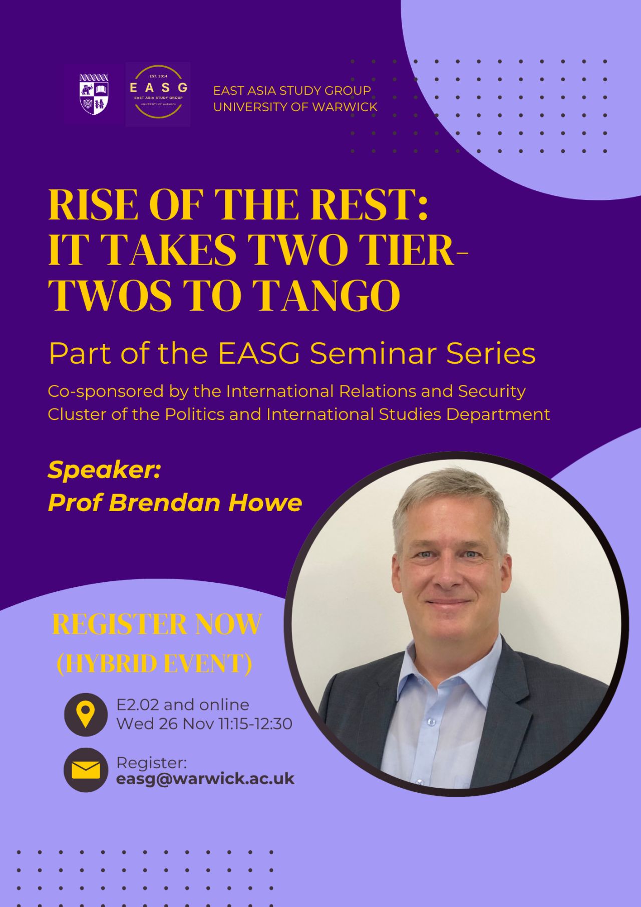 The University of Warwick East Asia Study Group (EASG) is a research network focused on the politics and international relations of the East Asian region. We aim to encourage discussion and investigation of the paradoxical challenges the East Asian region poses to traditional IR theories: why does a developed state like Japan eschew a regional security role and constrain its own military; why has China, the world’s second largest economy, enjoyed such success without adopting free market or liberal principles; and why is the Association of Southeast Asian Nations seemingly disinterested in federalisation and continues to emphasise the sovereignty of its individual members? These paradoxes challenge traditional interpretations of security, economic development, multilateralism, national identity and many more besides.